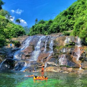 Sau đó trên đường đi ghé khu du lịch Thác Nhị Hồ là một thác nước đẹp mà thiên nhiên đã hào phóng ban tặng nằm trong dãy núi Bạch Mã, là điểm trung tâm nằm trong thế tam giác giữa thành phố Huế, Bạch Mã, Lăng Cô.